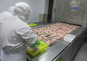 - 冷凍原料を解凍して、フィーレ加工を行なっています。鮮度を保つ為に、解凍後の品温を10℃以下にしています。